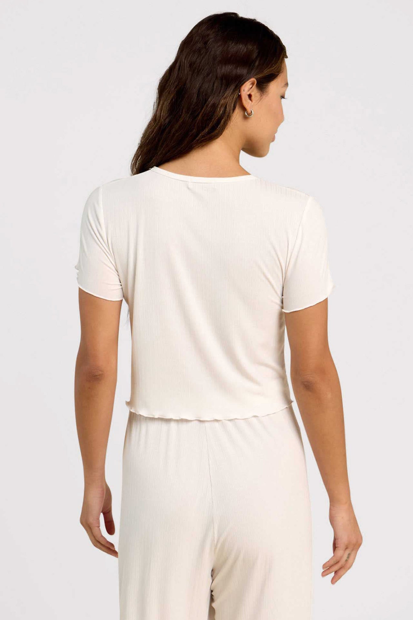 The silhouette you know, and love but in a luxurious lightweight fabric. The Mini Rib Tee is crafted from breathable ribbed fabric, making this piece just as soft as it is stylish. Its delectabledesign exudes femininity, with a cropped silhouette that accentuates the waistline and flatters the figure. Pair it with your favorite pair of pajama bottoms for the dreamiest cozy night.