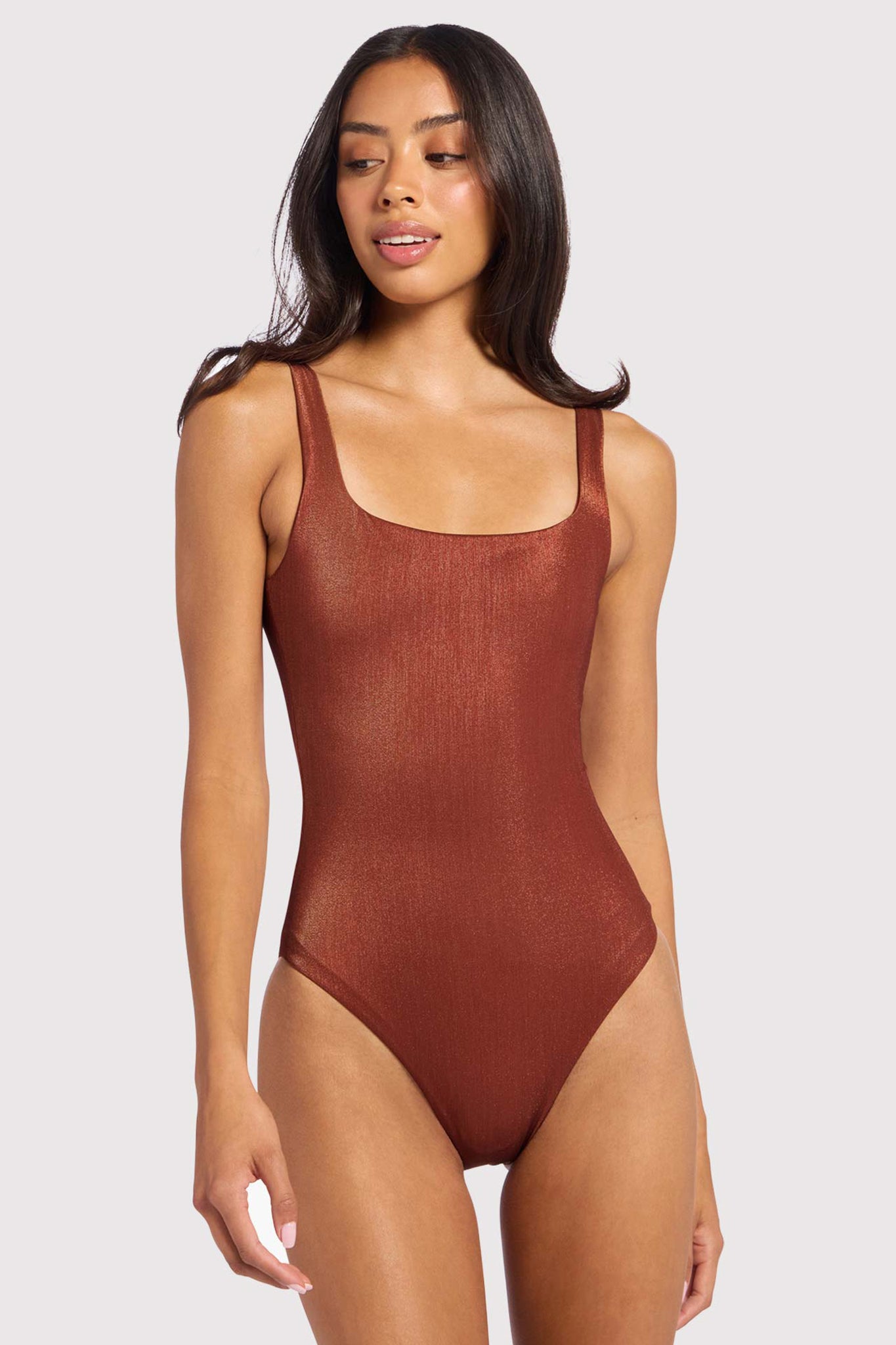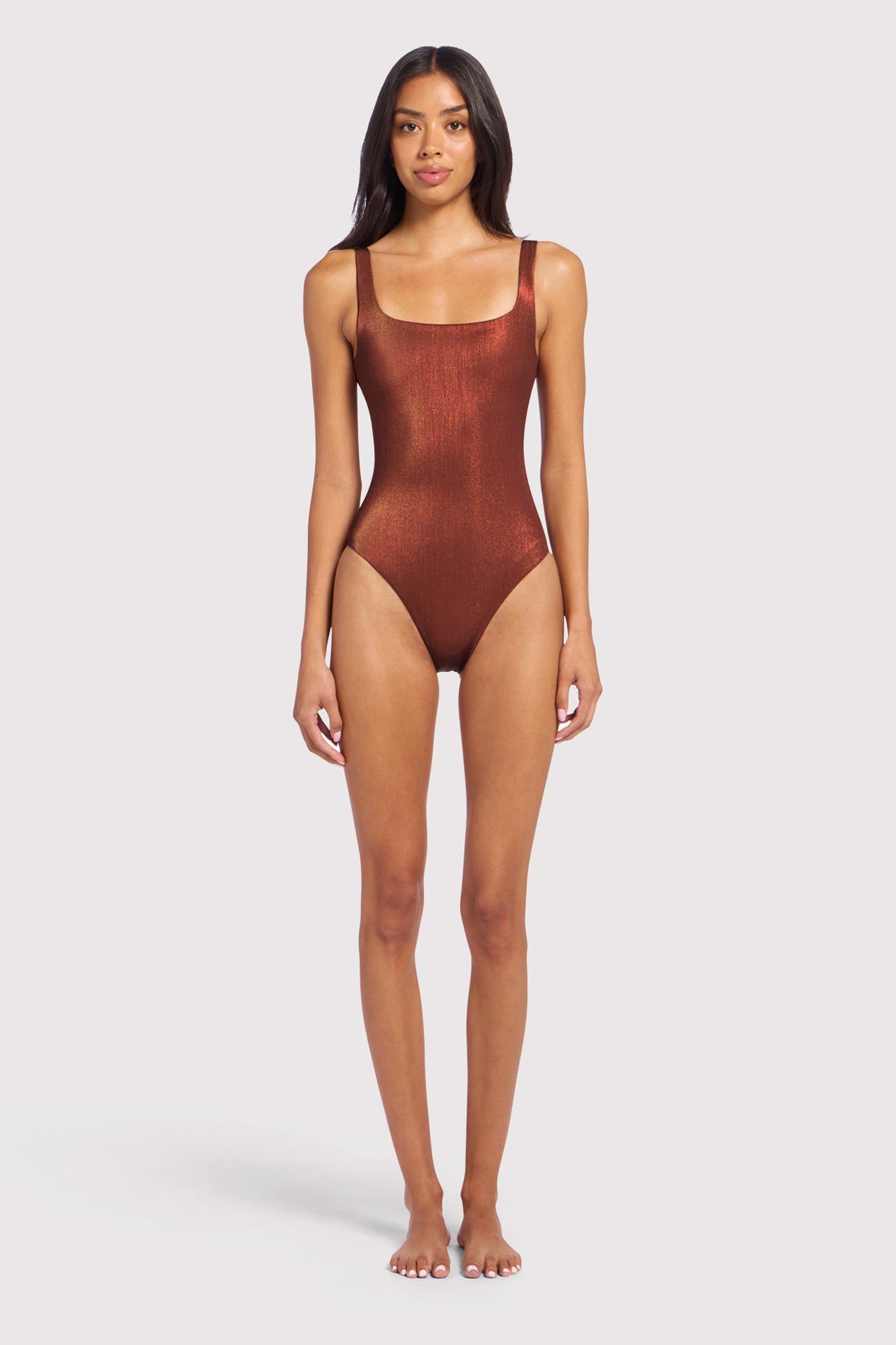 Timeless and flattering, the Shimmer Square Neck One Piece is your go-to for confident, effortless style. Made from soft printed fabric with a subtle shimmer, it combines a compressive, structured fit that smooths and supports. A feminine square neckline and low scoop back offer a classic silhouette, while signature overlock stitching at the seams creates a clean, sleek finish. Soft elastic at the neckline, armholes, and leg openings keeps everything comfortably in place.