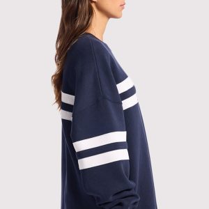 The Varsity Crewneck delivers a sporty, oversized take on a classic crewneck designed for everyday comfort and effortless layering. Made with a soft, mid-weight fabric blend, this women’s sweatshirt features a relaxed fit with drop shoulders and bold stripe detailing for a laid-back yet elevated look. Cozy without feeling heavy, it’s perfect for pairing with matching sweat sets, denim, or your go-to lounge bottoms. Whether worn at home or styled out, this cozy sweater is an easy essential for women who want comfort with a modern edge.