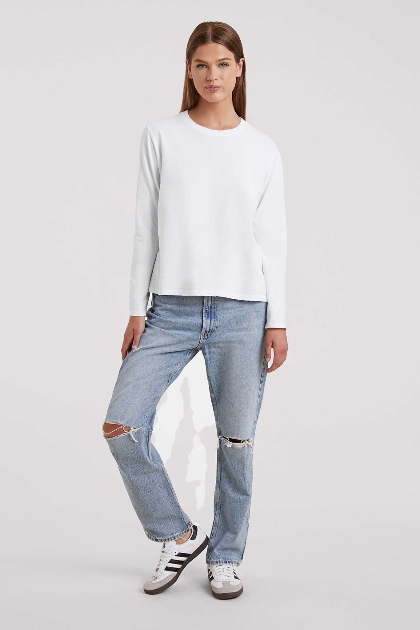 The Long Sleeve Everyday T-Shirt brings effortless comfort to cooler days with the same relaxed feel you love from the original Everyday T-Shirt. Made from soft vintage cotton, it features a slightly oversized fit with distressed details for that naturally lived-in look. Designed to hit at the hip with flexible side seams that allow for the perfect drape and front tuck, this long sleeve tee is an easy essential for layering, lounging, or everyday wear. Comfortable, classic, and endlessly versatile — it’s the long sleeve you’ll reach for again and again.