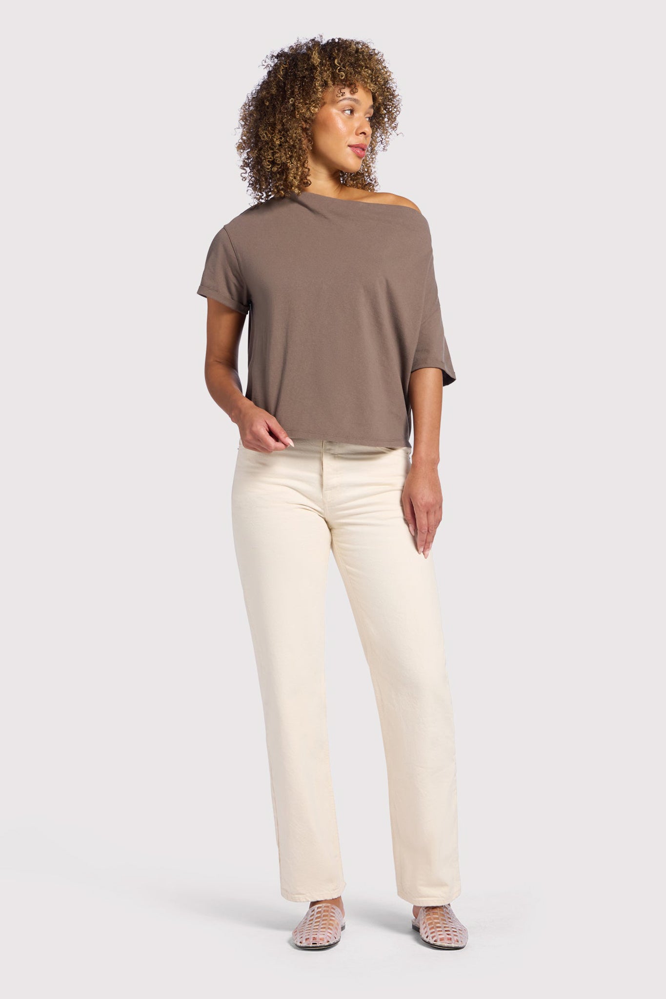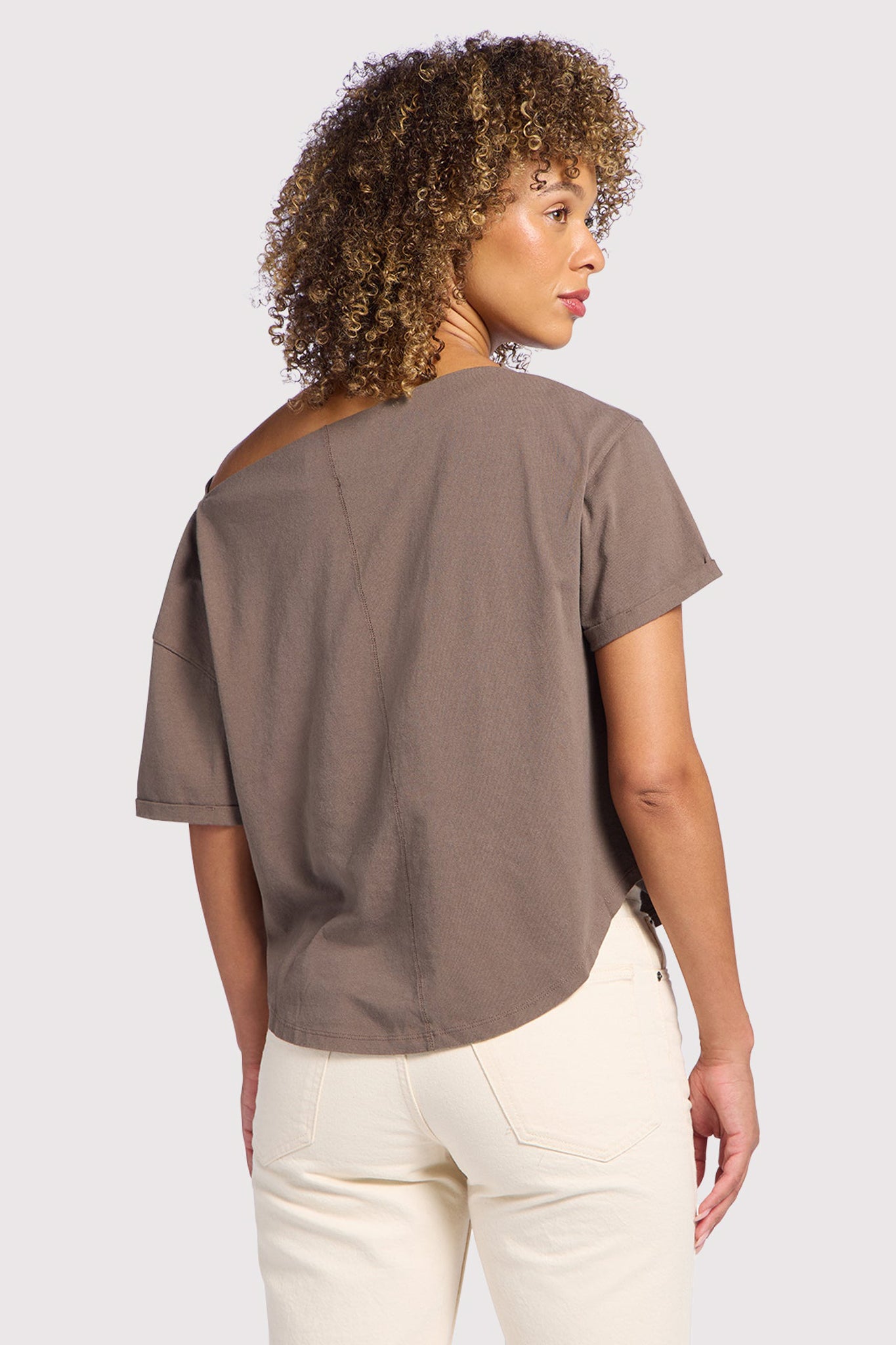 A modern twist on a classic tee, the Off The Shoulder T-Shirt is designed to drape effortlessly for a chic, relaxed look. With a neckline that naturally falls off one shoulder or can be worn as a wide boat neck, this top brings an elevated, easygoing vibe to your everyday style. Crafted from soft vintage cotton with cuffed sleeves and a naturally oversized fit, it’s flattering, comfortable, and perfect for tucking into your favorite denim or pairing with relaxed essentials.