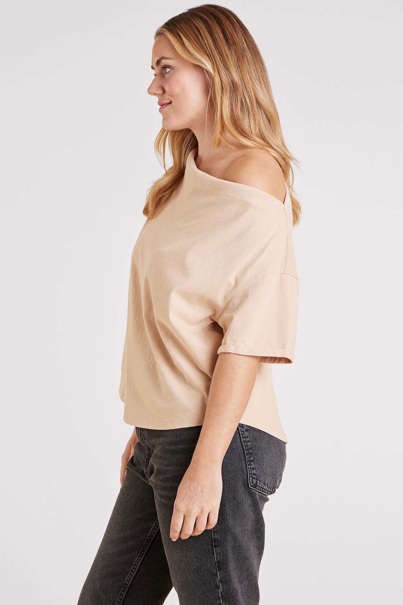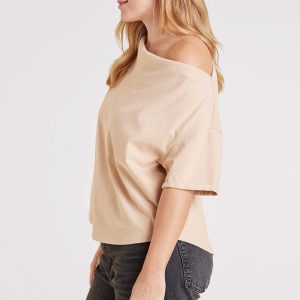A modern twist on a classic tee, the Off The Shoulder T-Shirt is designed to drape effortlessly for a chic, relaxed look. With a neckline that naturally falls off one shoulder or can be worn as a wide boat neck, this top brings an elevated, easygoing vibe to your everyday style. Crafted from soft vintage cotton with cuffed sleeves and a naturally oversized fit, it’s flattering, comfortable, and perfect for tucking into your favorite denim or pairing with relaxed essentials.