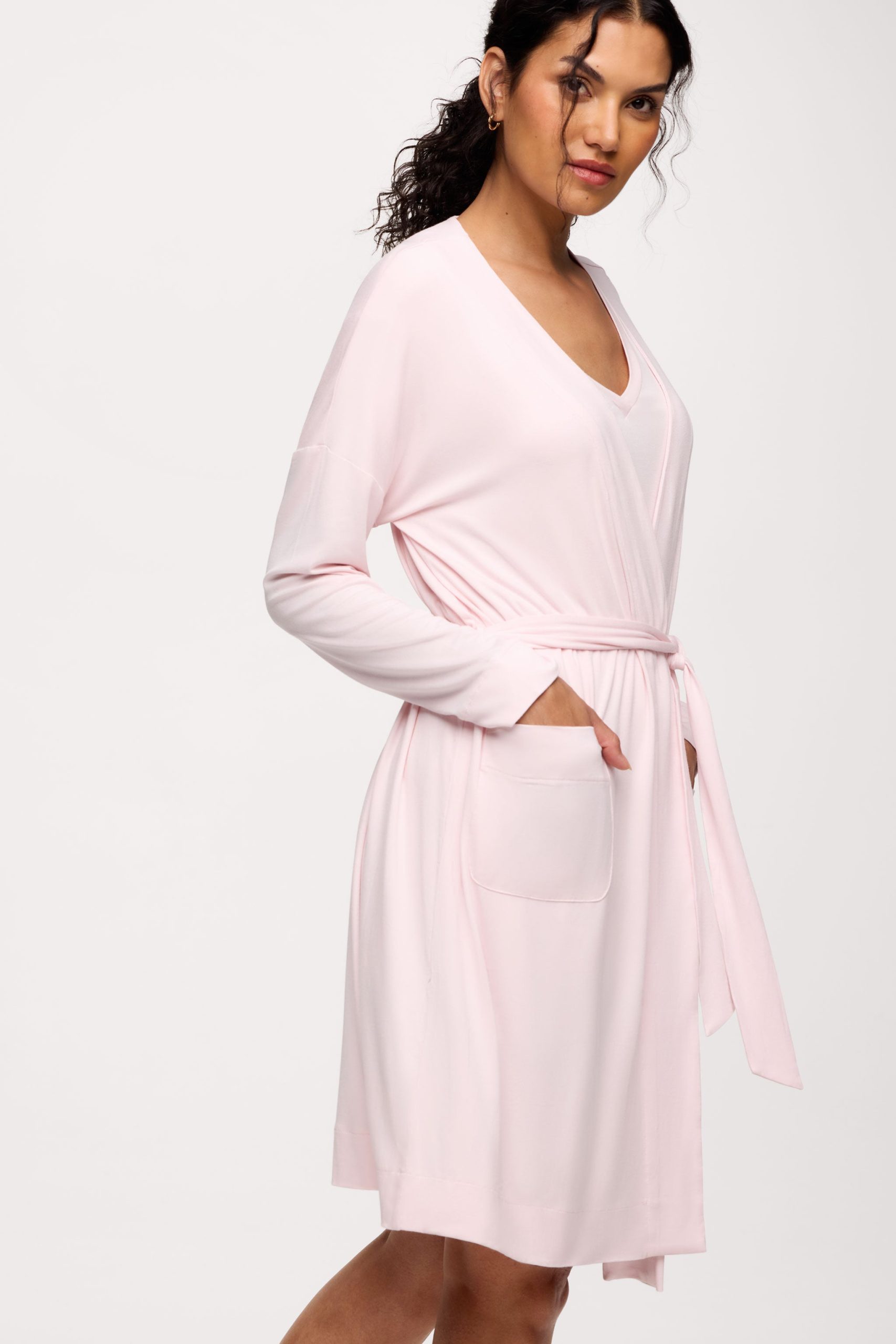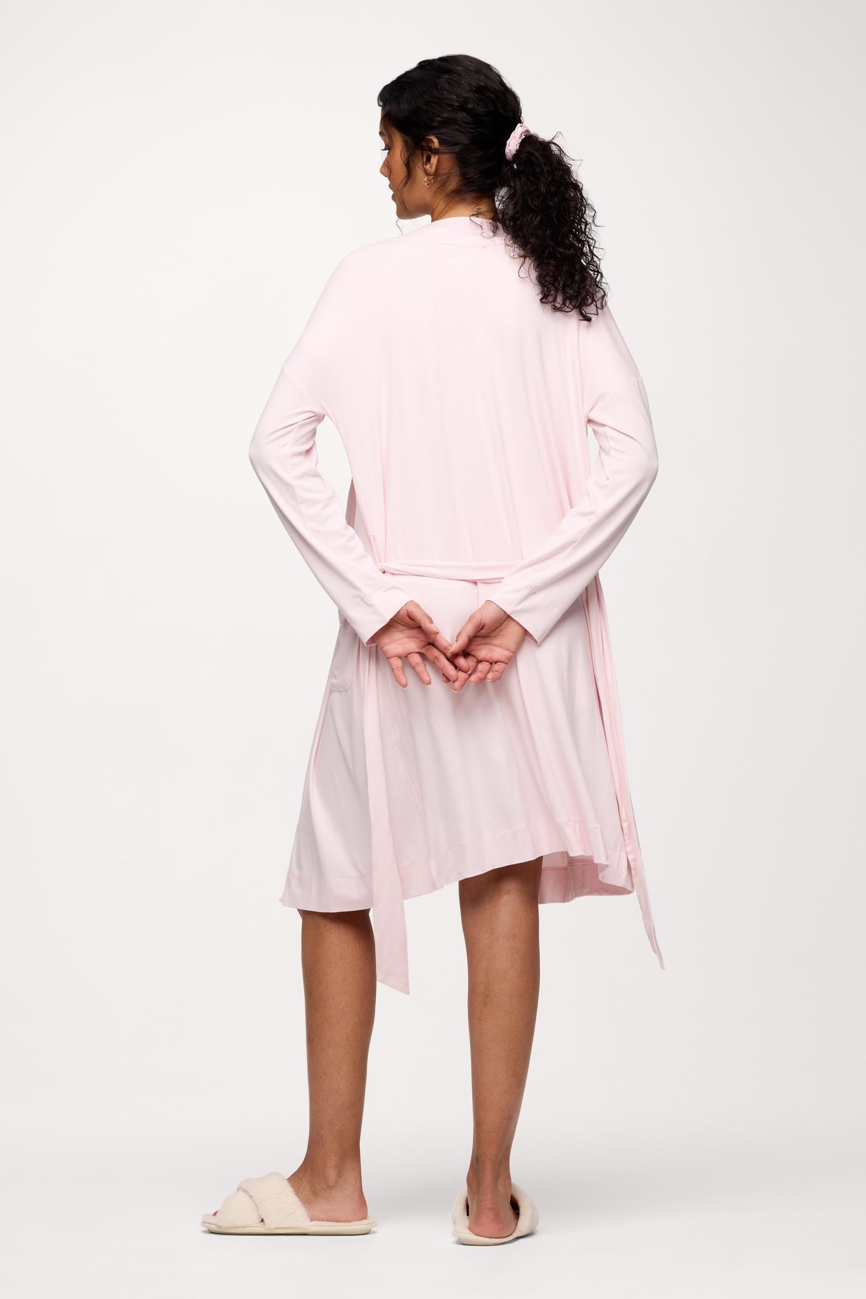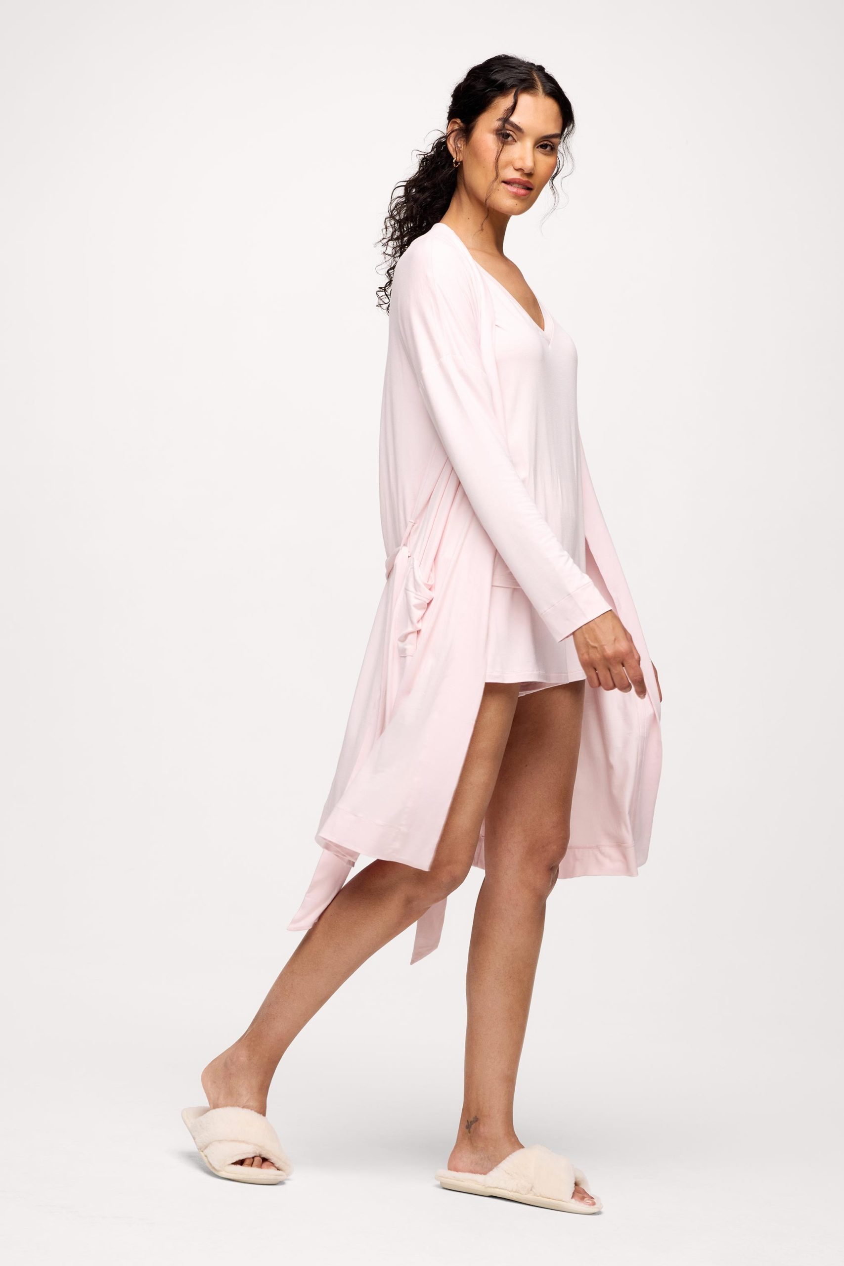 Sweat-free GRWM moments in this little number. A light and airy take on your favorite robe, featuring a self-tie belt and two front pockets. A perfect pair with any of our pajamas.