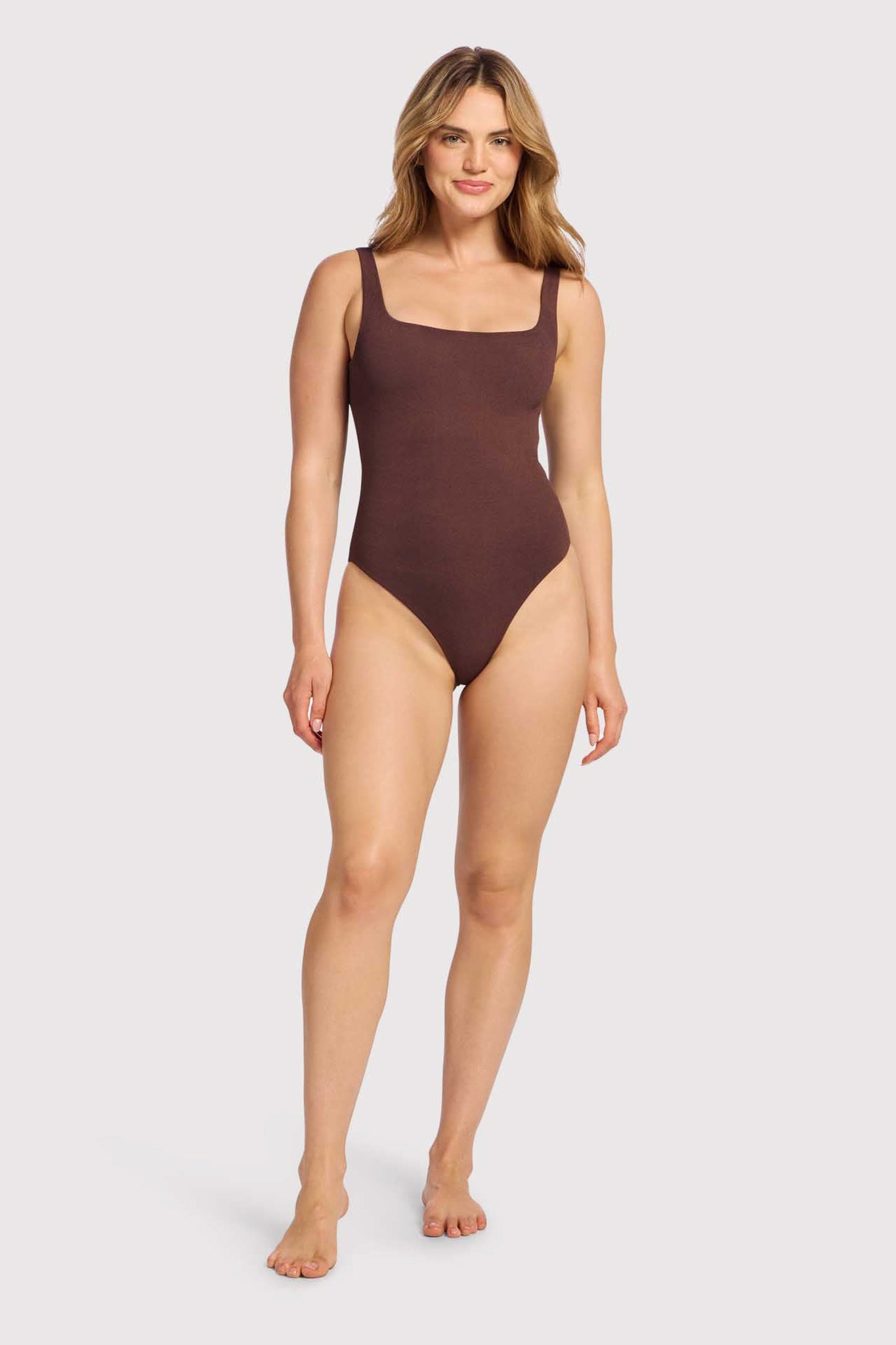Flattering and feminine, this one-piece features a soft square neck and low scoop back. Signature overlock stitching offers a sleek finish, while soft elastic at the neckline, armholes, and leg openings ensures a secure fit. Made from textured fabric with compression and extra stretch, it molds to your body for all-day comfort.