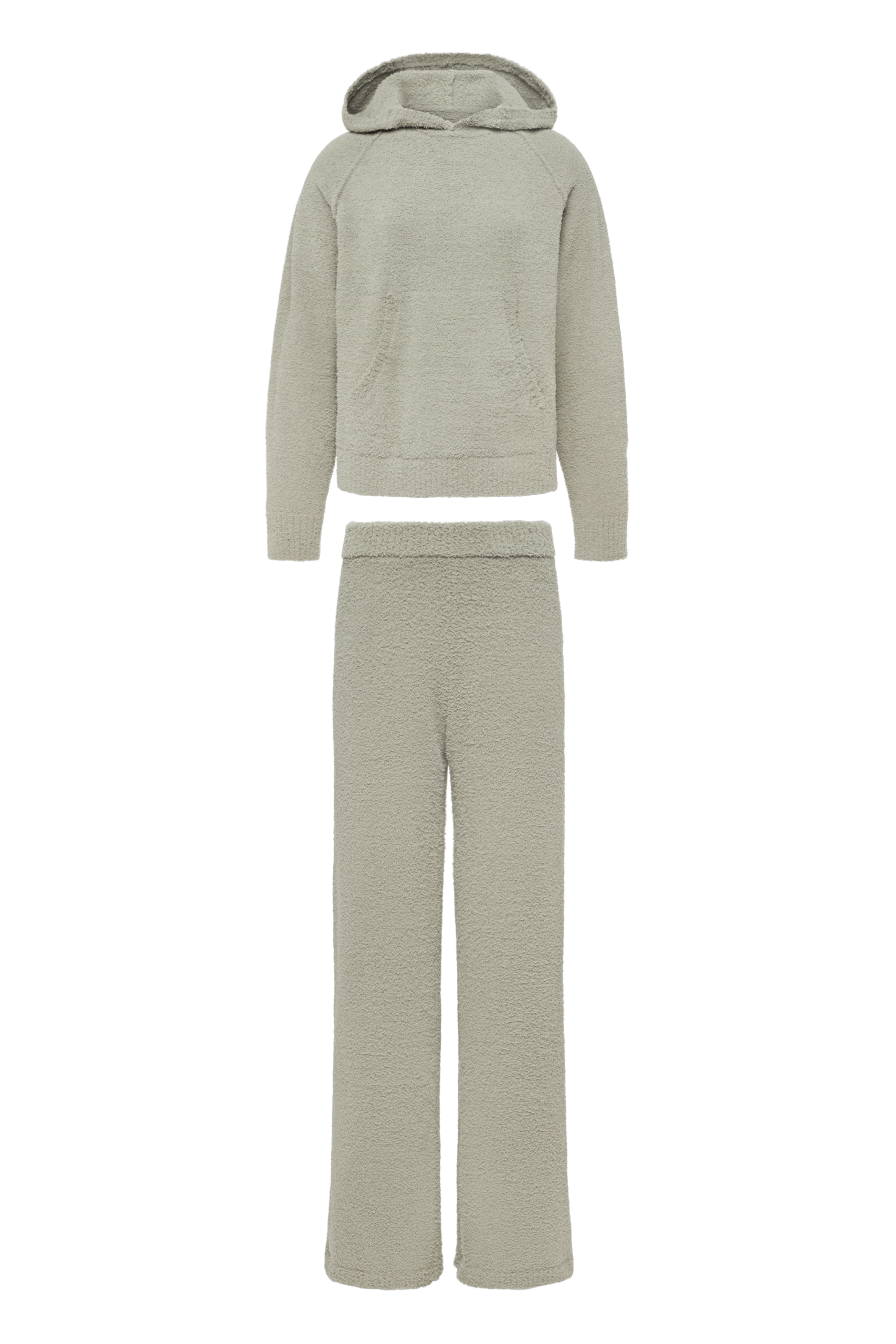 It’s like being wrapped in your favorite blanket, but socially acceptable to wear outside. Made from ultra-plush teddy knit, this set brings warmth, softness, and just enough structure to feel put-together. With the cozy sweater top and wide-leg pant, this is the coziest sweat set you’ll reach for again and again.