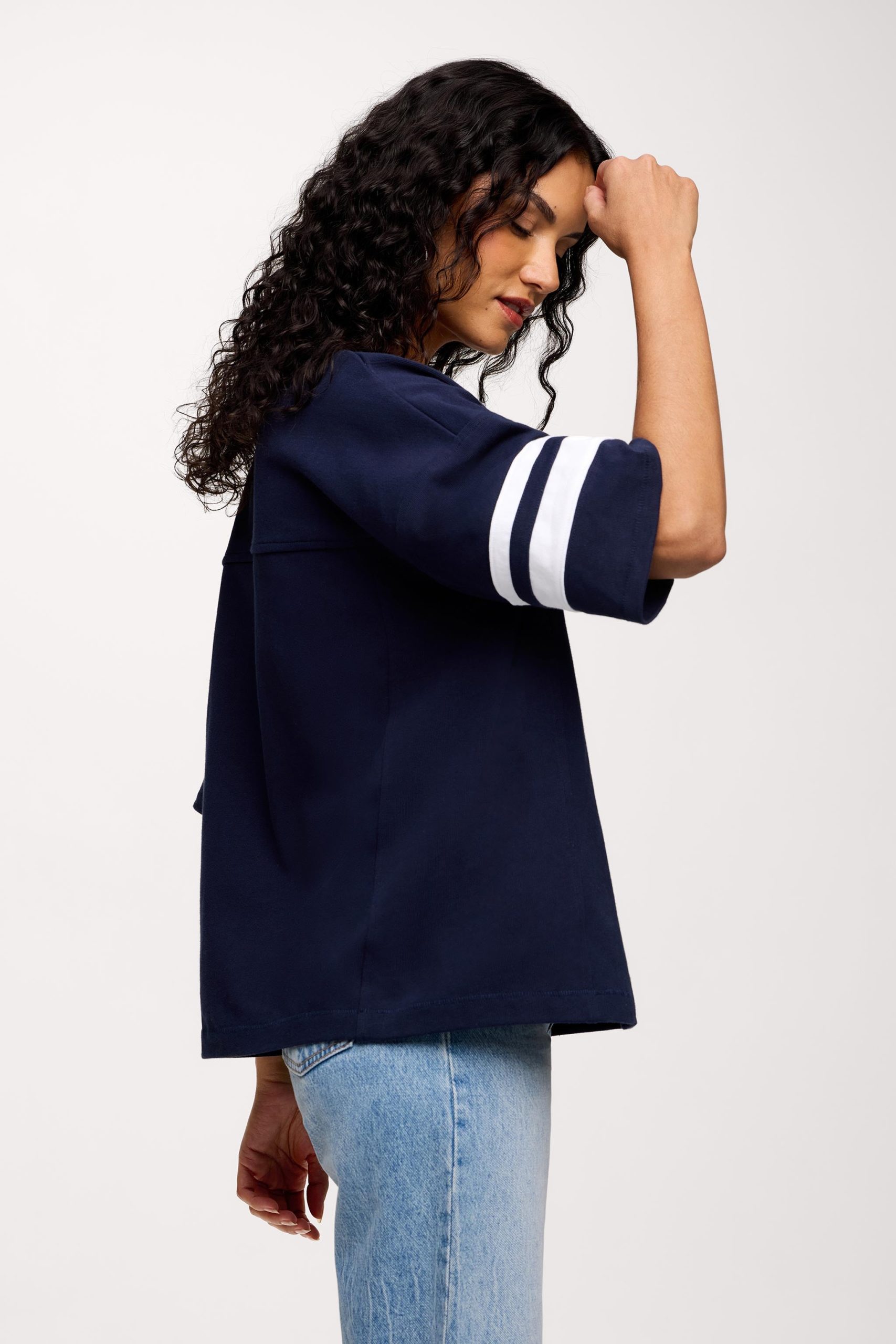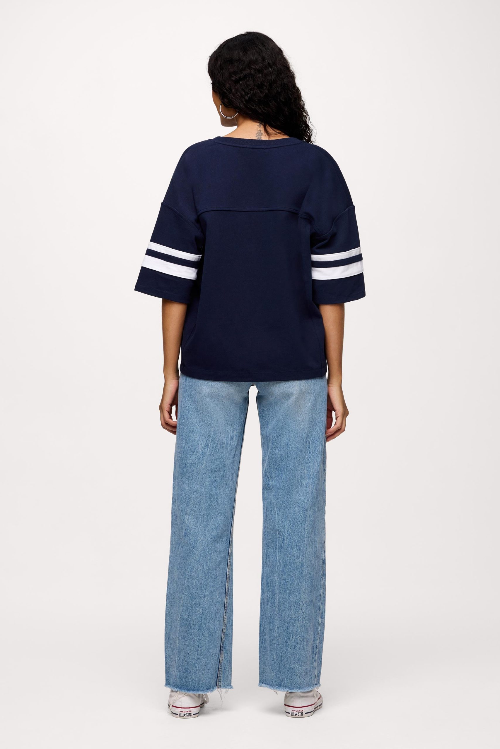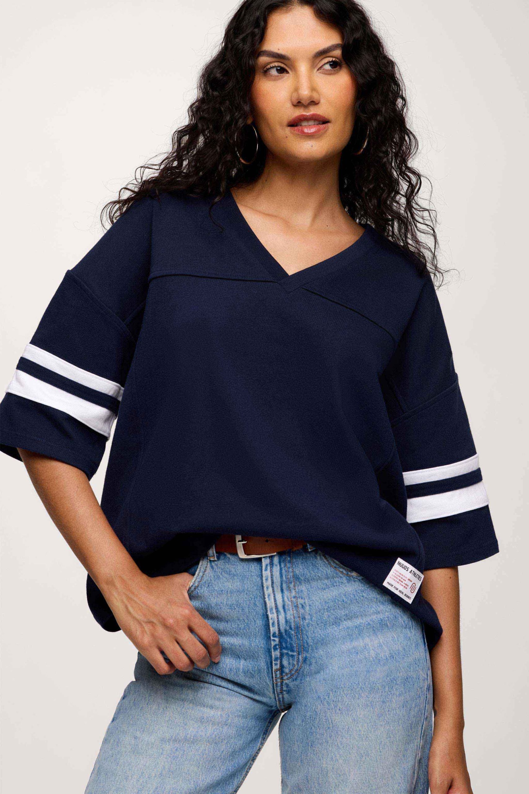 The Touchdown Tee brings a sporty, vintage-inspired feel to your everyday wardrobe. Designed with an oversized, boxy silhouette and classic V-neckline, it delivers effortless comfort with a modern athletic twist. The medium-weight cotton adds softness and structure, while the bold sleeve stripes and drop-shoulder fit create that laid-back retro look you’ll want to wear on repeat. Perfect for weekend plans, game-day moments, or casual everyday styling, it’s the elevated basic that always plays well with your favorite denim and loungewear.