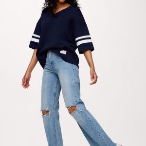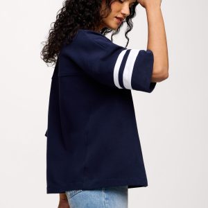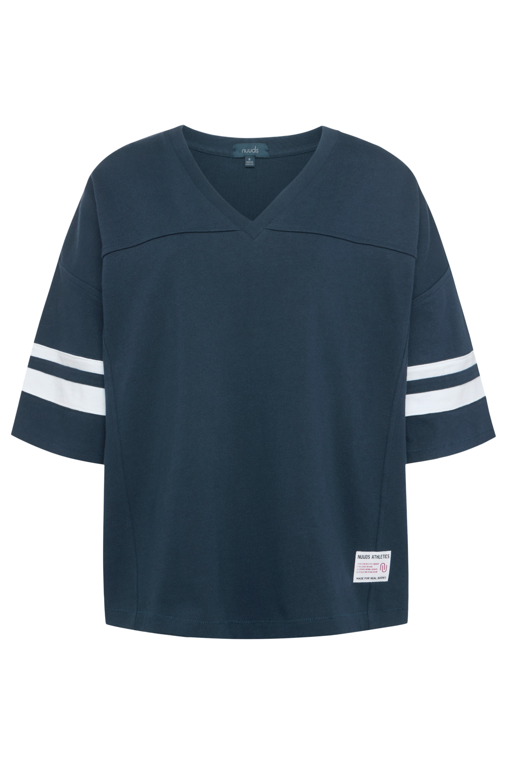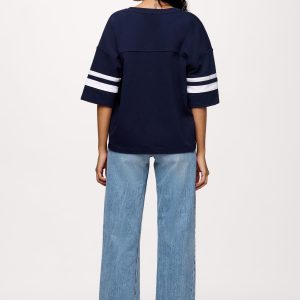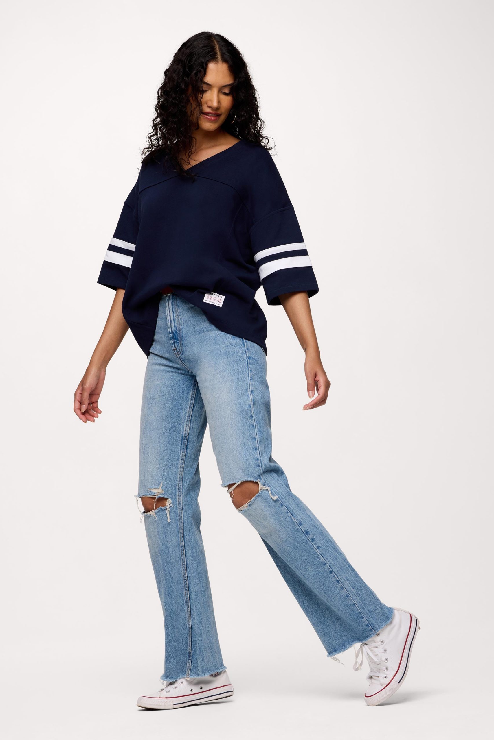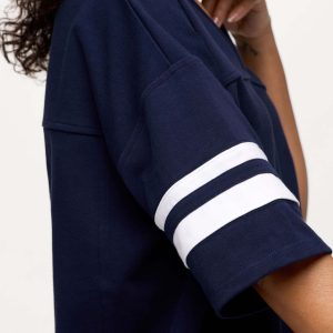 The Touchdown Tee brings a sporty, vintage-inspired feel to your everyday wardrobe. Designed with an oversized, boxy silhouette and classic V-neckline, it delivers effortless comfort with a modern athletic twist. The medium-weight cotton adds softness and structure, while the bold sleeve stripes and drop-shoulder fit create that laid-back retro look you’ll want to wear on repeat. Perfect for weekend plans, game-day moments, or casual everyday styling, it’s the elevated basic that always plays well with your favorite denim and loungewear.
