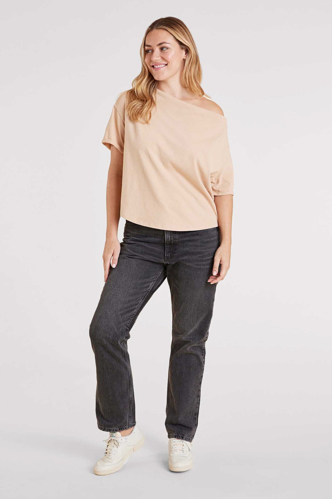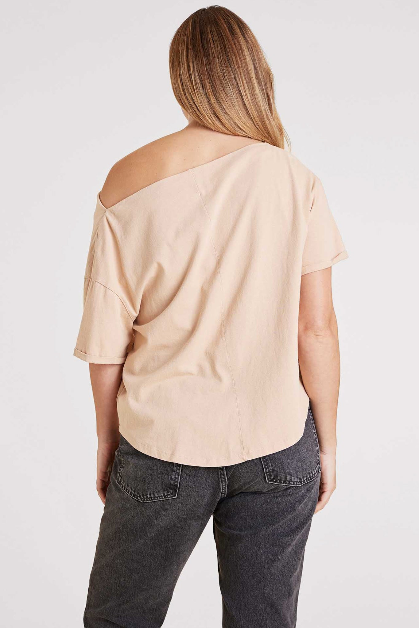 A modern twist on a classic tee, the Off The Shoulder T-Shirt is designed to drape effortlessly for a chic, relaxed look. With a neckline that naturally falls off one shoulder or can be worn as a wide boat neck, this top brings an elevated, easygoing vibe to your everyday style. Crafted from soft vintage cotton with cuffed sleeves and a naturally oversized fit, it’s flattering, comfortable, and perfect for tucking into your favorite denim or pairing with relaxed essentials.
