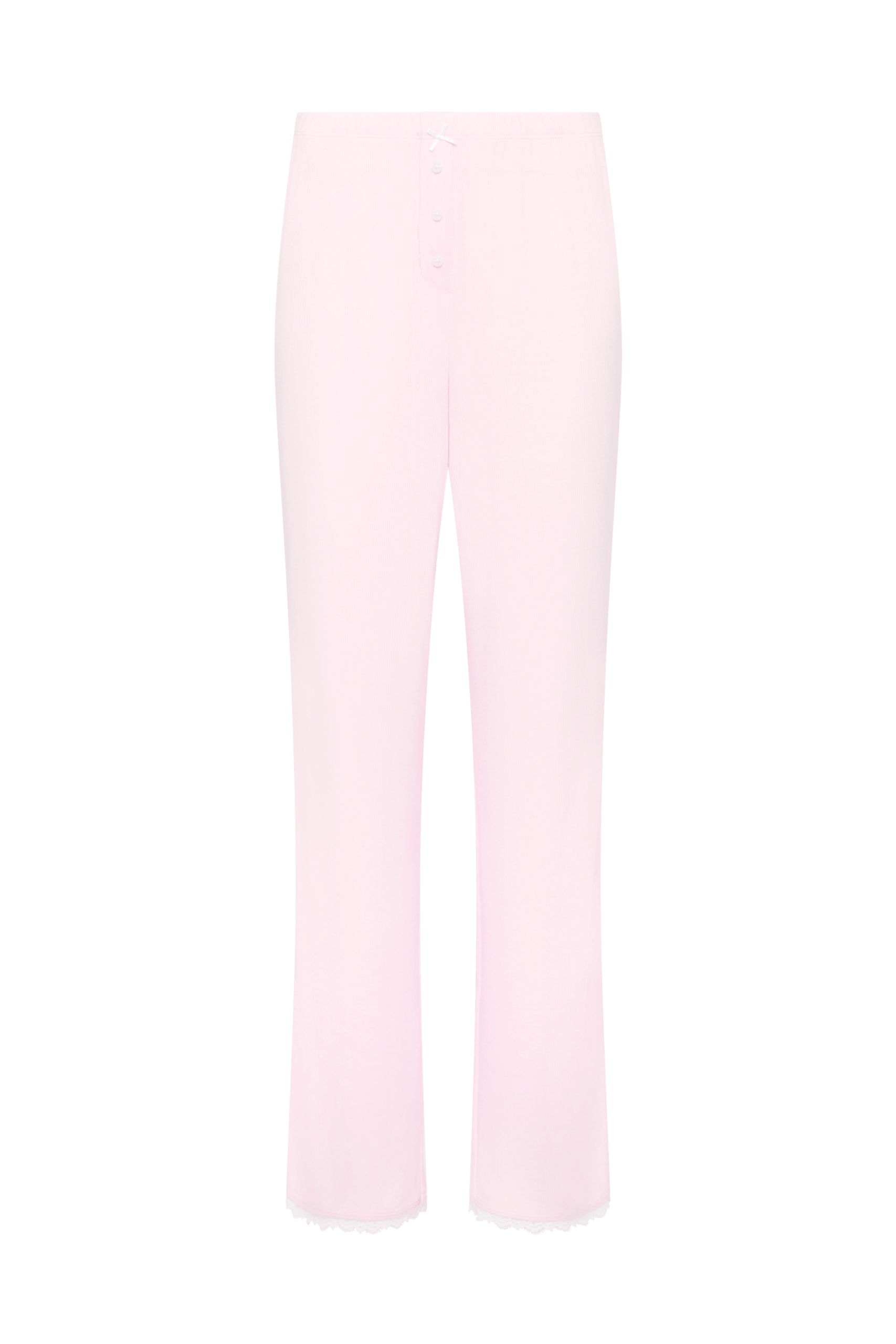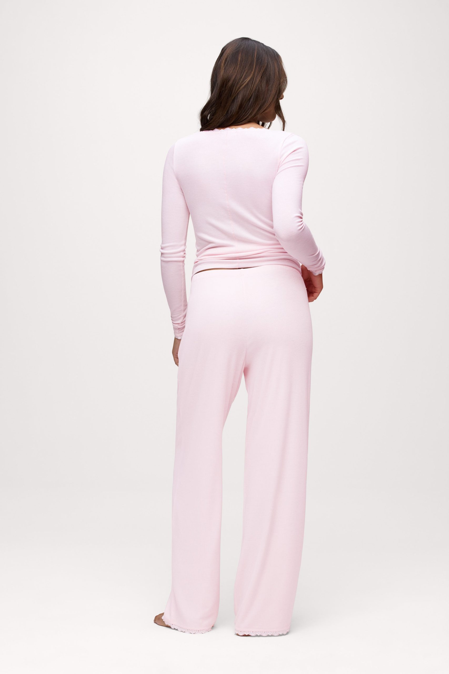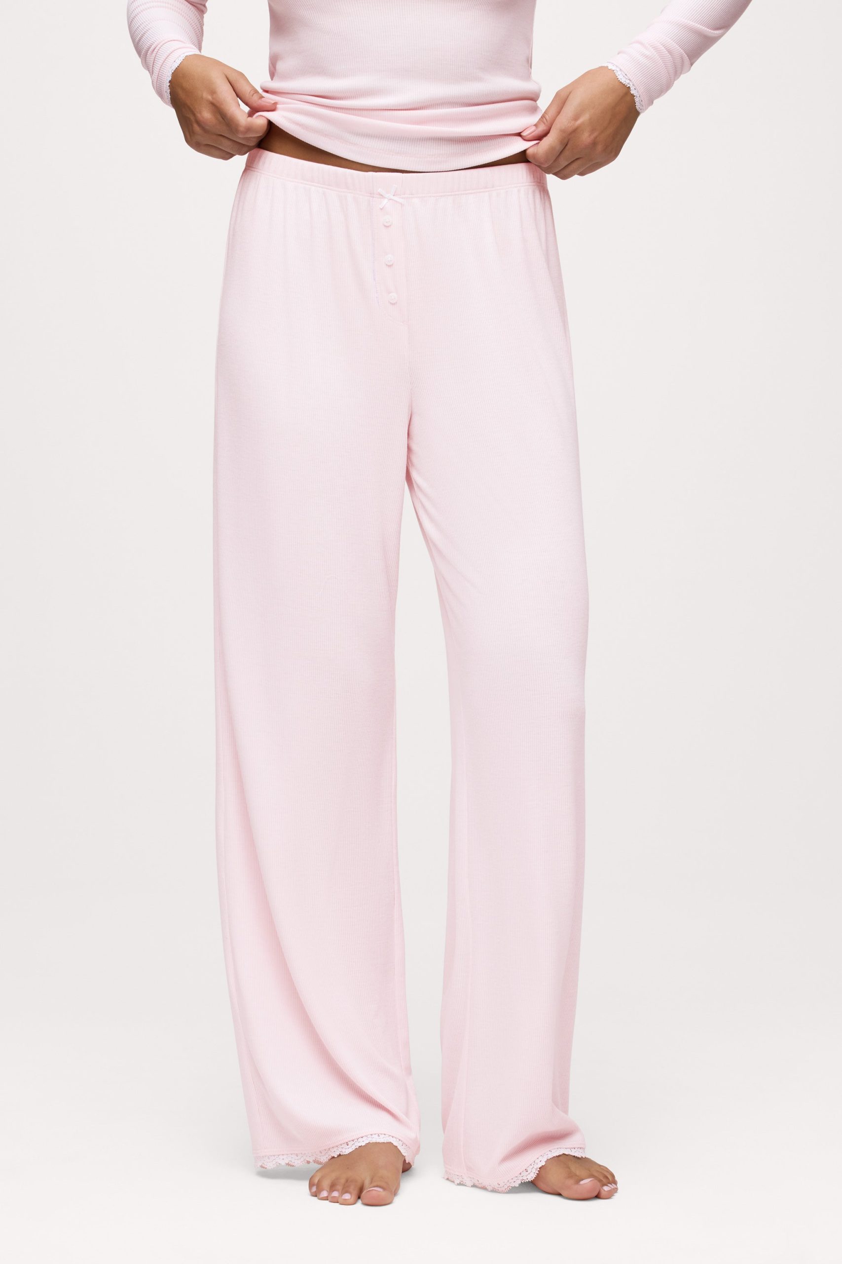 A softly draped ribbed wide-leg pajama pant with a relaxed, flattering shape. Designed to sit comfortably at the waist, it features subtle button detailing and a satin bow, with delicate lace along the hem for a feminine finish. Pair it with the Sweetheart Pajama Top for a cohesive, elevated set.